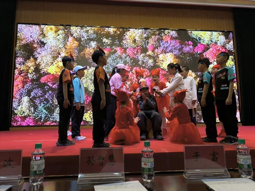 活动在五大连池世界地质公园第一小学拉开帷幕。第一小学学生身着自制“熔岩服”“火山灰披风”,以生动活泼的情景剧再现了20万年前老黑山火山喷发的壮阔场景。“岩浆”顺着舞台流淌,“火山灰”漫天飘洒,小演员们用童真的语言讲述着火山碎屑流、熔岩台地等地质概念的形成过程。这场由孩子们自编自导的《火山觉醒》短剧,将复杂的地质演化史转化为可视化的戏剧语言,引得现场观众阵阵掌声。