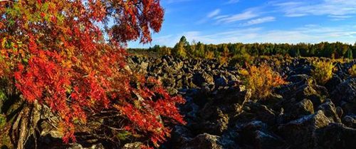 在新期火山观光区老黑山,高富氧离子含量的空气里弥漫着秋季树木特有的香气,当壮美的火山与绚丽的五花山色交融,便演绎出了最美的相遇。